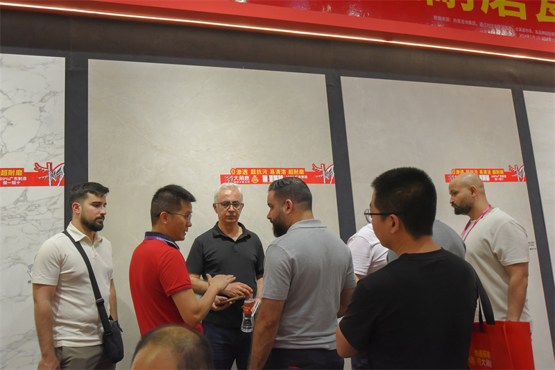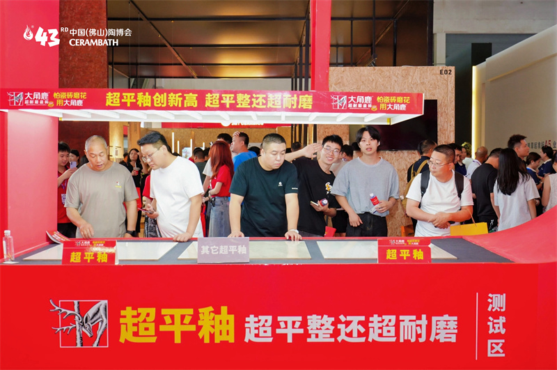 展会现场,大角鹿通过多系列产品展示与实物对比,直观呈现“超平釉”的产品实力,吸引众多海内外采购商驻足体验、连连点赞,现场氛围持续升温。“超平釉+超耐磨”成为本届展会的热点风向标。