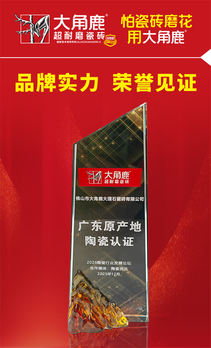 12月22日,由陶瓷资讯主办,中国陶瓷工业协会、中国建筑材料流通协会指导的“2026陶瓷行业发展论坛”在佛山顺德成功举办?;嵘?,全球超耐磨瓷砖销量第一品牌大角鹿凭借源自广东的卓越制造品质和引领全球的超耐磨技术,荣获“广东原产地陶瓷认证”重量级大奖。