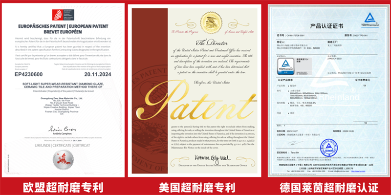 十余年来,大角鹿聚焦超耐磨陶瓷新材料领域持续攻坚,围绕自主研发的超耐磨钻石釉技术完成四轮迭代,建立起完整、独立的国家发明专利体系。其最新一代蓝宝石晶体超耐磨钻石釉,已实现6000转极限耐磨性能,领先行业3至5年。依托持续的技术积累,大角鹿已掌握行业超70%的超耐磨发明专利,取得美国、欧盟超耐磨发明专利及德国莱茵TÜV超耐磨认证,打破了长期由外资主导的技术壁垒,是全球耐磨度领先且拥有超耐磨发明专利数量最多的中国瓷砖品牌。