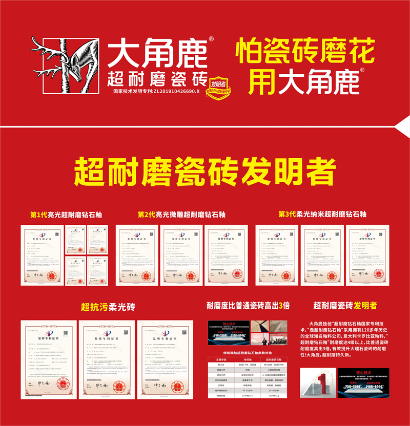 目前,大角鹿掌握中国超过70%的超耐磨发明专利,并获得美国、欧盟超耐磨发明专利,成为耐磨度全球第一、超耐磨发明专利数量第一的瓷砖品牌。